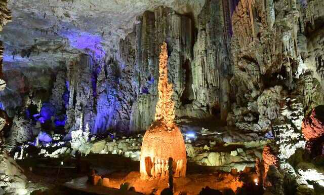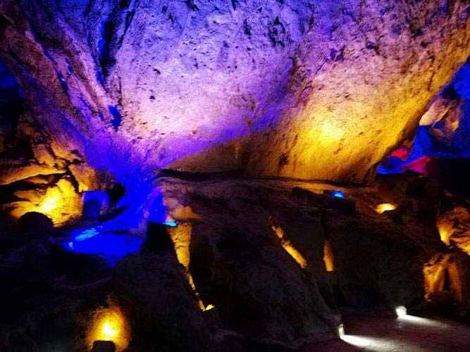 織金洞,位于畢節市織金縣官寨苗族鄉,為大型石灰巖溶洞,分三層,全長(cháng)6.6公里;洞中遍布石筍、石柱、石芽、石旗等40多種溶洞堆積物,形成千姿百態(tài)的溶洞景觀(guān)??椊鸲匆猿蟮囊幠?、豐富的內容、齊全的溶洞景觀(guān)而被公認為中國最美溶洞之一。