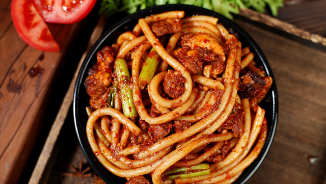 說(shuō)了這么多南方米粉,接下來(lái)咱們看一看來(lái)自祖國西北邊陲的新疆炒米粉。新疆炒米粉不如南方米粉那么纖細苗條,它的粉條特別粗,需要費點(diǎn)牙口才能咬斷,就跟西北人的性格一樣,放蕩不羈、豪邁爽朗。新疆除了大盤(pán)雞比較出名外,就數炒米粉最受歡迎了,甚至一度火到了國外,惹得老外連意大利面都不吃了,天天跑去吃米粉。新疆炒米粉有微辣、中辣以及爆辣三種口味,據說(shuō)就連川渝地區的老鐵都hold不住爆辣口味的炒米粉,因為它實(shí)在是太辣了,每一根米粉上都裹滿(mǎn)了辣醬,讓舌頭無(wú)處可逃。奇怪的是新疆炒米粉越辣越好吃、越辣越過(guò)癮,配上烤馕之后,那味道更是一絕。