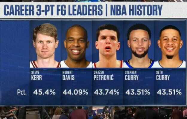 NBA歷史三分榜是指在NBA常規賽賽場(chǎng)上球員所命中的所有三分總和,季前賽、季后賽、夏季聯(lián)賽和全明星賽的三分球命中數不計在內。有媒體統計了NBA歷史三分命中率球員排行榜,在這份榜單的前五名中,我們注意到,現勇士隊主教練科爾以45.4%的三分球命中率高居歷史第一,他曾經(jīng)創(chuàng )下單賽季52.4%的三分球命中率紀錄,而他的弟子庫里,則排在這份榜單的第四名,令人驚訝的是,庫里的弟弟塞斯庫里排在第五位,史蒂芬和塞斯職業(yè)生涯的三分命中率都為43.51%的命中率。由于史蒂芬出手次數更多,所以他排在這份榜單的第四名,他們的老爸戴爾-庫里排在榜單第37名,老庫里職業(yè)生涯三分3098投中1245,三分球命中率40.2%,也算是十分不錯的成績(jì)。下面就讓我們一起來(lái)看看NBA三分命中率排名前十的神射手。