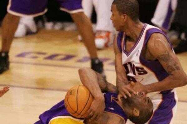 巔峰時(shí)期的科比是聯(lián)盟最難防守的球員,因為他技術(shù)全面,意志堅決,但在與太陽(yáng)的季后賽中,科比遭到了對方球員最為兇狠的防守,即從背后鎖喉放倒。