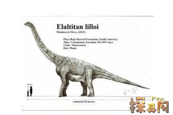 埃拉爾巨龍生存在白堊紀晚期的南美洲阿根廷,化石首次發(fā)現在1979年,處在地質(zhì)年代約9650萬(wàn)到8930萬(wàn)年前于Bajo Barreal組的下層。體長(cháng)達到近30米,體重80噸上下,成為最大型的蜥腳類(lèi)恐龍之一。