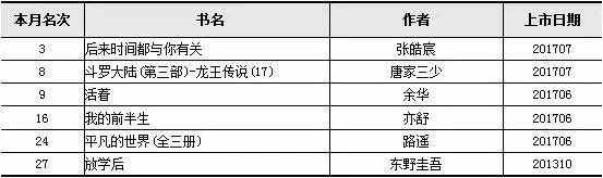 2017年8月,有不少新面孔出現在開(kāi)卷虛構類(lèi)暢銷(xiāo)榜上。本月共有6種首次上榜圖書(shū),其中張皓宸的《后來(lái)時(shí)間都與你有關(guān)》首次入榜即排名第3名,這與作者在本月進(jìn)行了一系列簽售活動(dòng)有關(guān),同時(shí)也證明了張皓宸這樣的“暖男”作者所擁有的巨大粉絲量帶來(lái)的影響。亦舒的《我的前半生》因為改編電視劇的熱播,在本月也進(jìn)入了榜單前30名。余華的《活著(zhù)》和路遙的《平凡的世界》都是經(jīng)久不衰的暢銷(xiāo)書(shū),本月兩種書(shū)各有一個(gè)新版本首次入榜。此外,本月首次上榜的還有“龍王傳說(shuō)”系列的最新作和東野圭吾的經(jīng)典作品《放學(xué)后》。